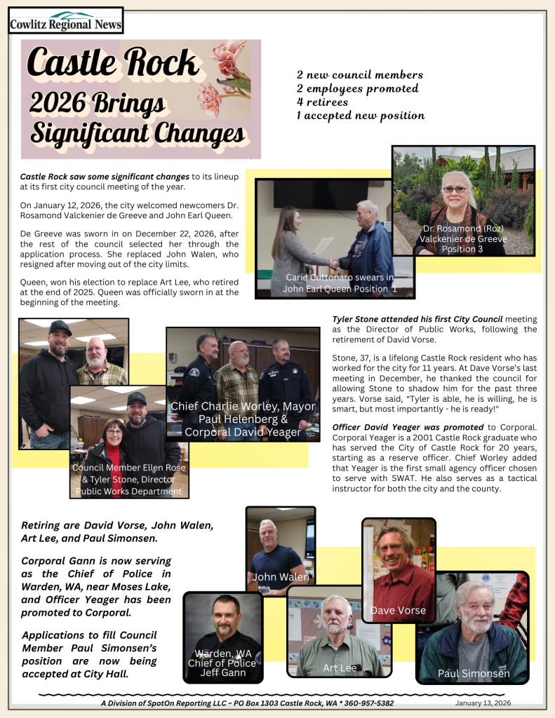 NewsCastle Rock – 2026 Brings Significant Changes Guest Article2 weeks ago01 min Post navigation Previous: Cowlitz County Police Blotter 1/09/2026 – 1/15/2026Next: Castle Rock – Sinkhole/ Sewer Ling Collapse by Elementary School Leave a Reply Cancel replyYour email address will not be published. Required fields are marked *Comment * Name * Email * Website Save my name, email, and website in this browser for the next time I comment.