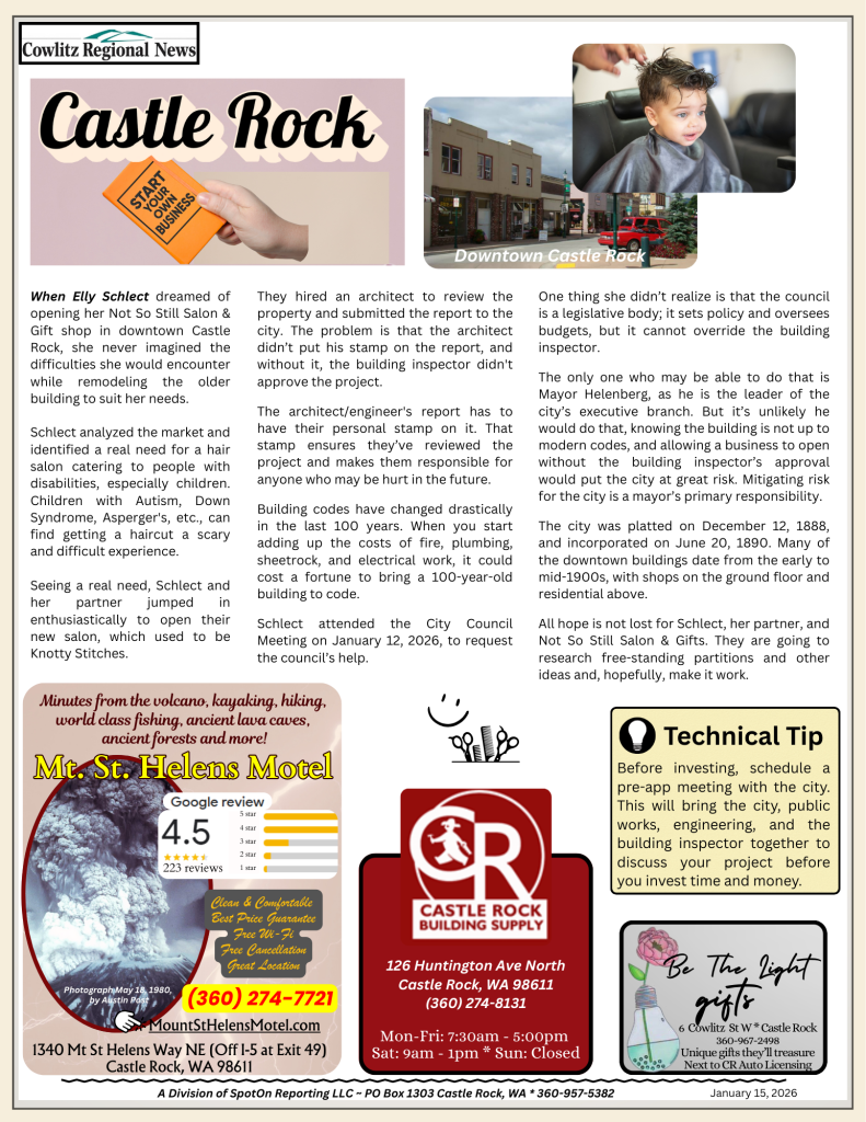NewsCastle Rock – Older Buildings Create Expensive Challenges for New Businesses Guest Article2 weeks ago2 weeks ago01 min Post navigation Previous: Castle Rock – Sinkhole/ Sewer Ling Collapse by Elementary SchoolNext: Cowlitz County Police Blotter 1/16/26 to 1/22/26 Leave a Reply Cancel replyYour email address will not be published. Required fields are marked *Comment * Name * Email * Website Save my name, email, and website in this browser for the next time I comment.