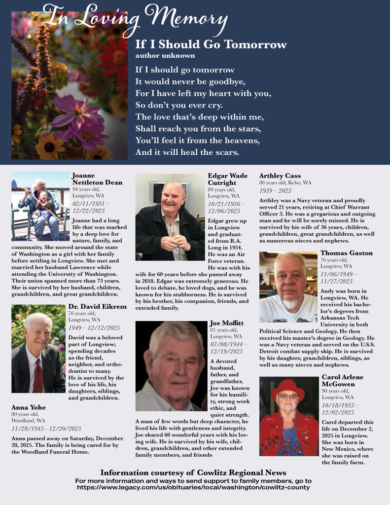 NewsCowlitz County Obituaries December 27, 2025 Guest Article1 month ago1 month ago11 min Post navigation Previous: Cowlitz County’s $1.4 Million ScamNext: Keeping Stress in Check – Guest Editorial From the Desk of Dr. Kirkpatrick One thought on “Cowlitz County Obituaries December 27, 2025” Good Morning , How would I go about having a obit published on your web sit and is there a charge . Robert was a resident for many years here at Campus Towers Reply Leave a Reply Cancel replyYour email address will not be published. Required fields are marked *Comment * Name * Email * Website Save my name, email, and website in this browser for the next time I comment.