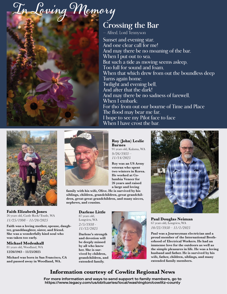 NewsCowlitz County Obituaries 12/3/2025 Guest Article2 months ago1 month ago01 min Post navigation Previous: Woodland City Council – New Dog Park?Next: From The Archives – A Special Note from Dr. Neal Kirkpatrick Leave a Reply Cancel replyYour email address will not be published. Required fields are marked *Comment * Name * Email * Website Save my name, email, and website in this browser for the next time I comment.