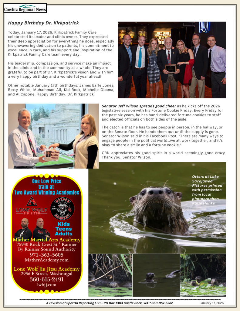 NewsHappy Birthday, Dr. Kirkpatrick Guest Article3 weeks ago01 min Post navigation Previous: Cowlitz 2 Fire & Rescue Battle Barn Fire in Rose ValleyNext: SB 5974 Gives Unelected Board Control of Local Elected Sheriffs Leave a Reply Cancel replyYour email address will not be published. Required fields are marked *Comment * Name * Email * Website Save my name, email, and website in this browser for the next time I comment.