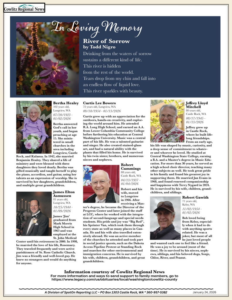 NewsCowlitz County Obituaries Jan 1 Guest Article3 weeks ago01 min Post navigation Previous: Wellness Check Ends Up In Arrest of Man with Stolen Vehicle in LexingtonNext: Cowlitz County Obituaries January 2026 Leave a Reply Cancel replyYour email address will not be published. Required fields are marked *Comment * Name * Email * Website Save my name, email, and website in this browser for the next time I comment.