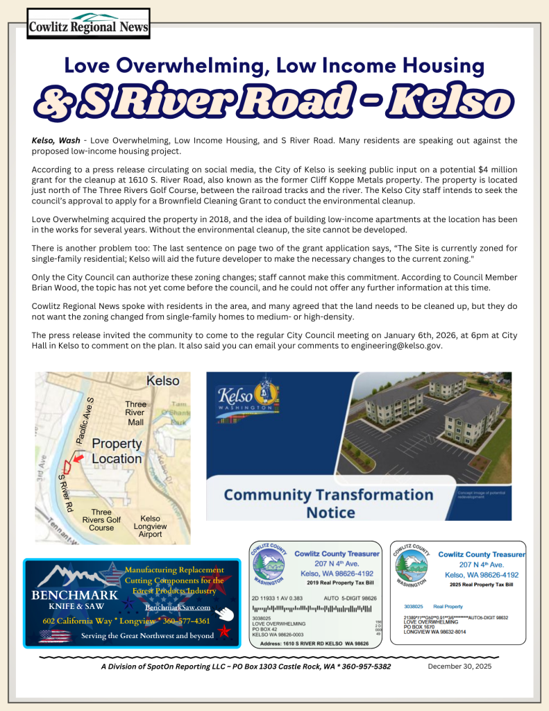 NewsLove Overwhelming, Low Income Housing, and South River Road Guest Article2 weeks ago01 min Post navigation Previous: Longview Utility Rates for 2026Next: Kelso’s Dilemma – Contaminated Land and Love Overwhelming as a Partner Leave a Reply Cancel replyYour email address will not be published. Required fields are marked *Comment * Name * Email * Website Save my name, email, and website in this browser for the next time I comment.
