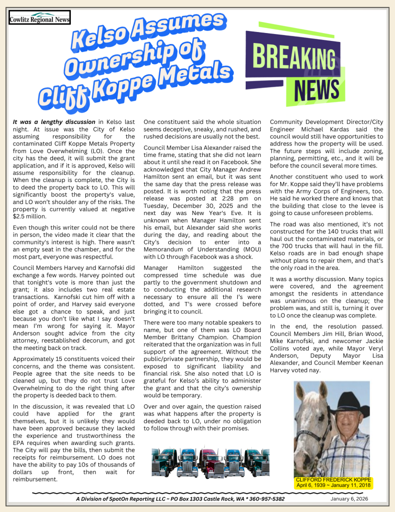 NewsKelso – Assumes Ownership of Cliff Koppe Metals Guest Article2 weeks ago01 min Post navigation Previous: Kelso’s Dilemma – Contaminated Land and Love Overwhelming as a PartnerNext: Castle Rock – Dave Vorse Retires After 44 Years with the City Leave a Reply Cancel replyYour email address will not be published. Required fields are marked *Comment * Name * Email * Website Save my name, email, and website in this browser for the next time I comment.