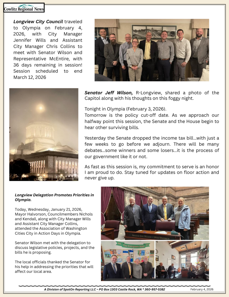 NewsLongview Officials Address Priorities in Olympia Guest Article3 weeks ago01 min Post navigation Previous: Cowlitz County – Man Arrested After Threatening to Kill Noisy KidsNext: WA Legislature Proposal Guts Local Camping Bans in Public Spaces Leave a Reply Cancel replyYour email address will not be published. Required fields are marked *Comment * Name * Email * Website Save my name, email, and website in this browser for the next time I comment.