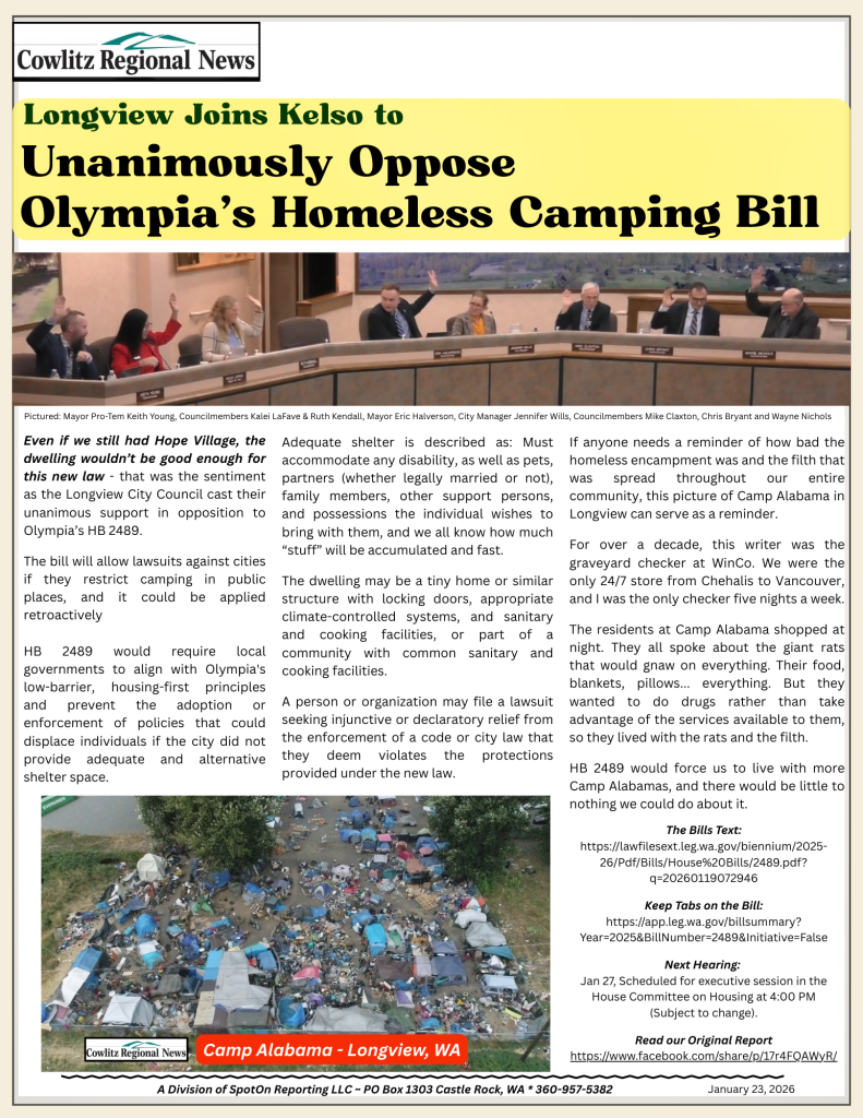 NewsLongview Opposes Olympia’s HB 2489 Homeless Camping Bill Guest Article2 weeks ago2 weeks ago01 min Post navigation Previous: RECLAIM & HOPE Village – what’s the realityNext: Longview Utility Rates for 2026 Leave a Reply Cancel replyYour email address will not be published. Required fields are marked *Comment * Name * Email * Website Save my name, email, and website in this browser for the next time I comment.