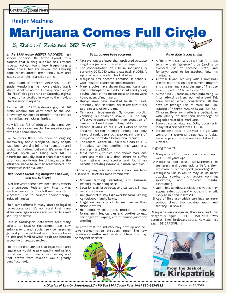 NewsMarijuana Comes Full Circle – From the Desk of Dr. Kirkpatrick Guest Article1 month ago1 month ago01 min Post navigation Previous: University of Washington Violates Professor’s First Amendment RightsNext: Cowlitz County Police Blotter 12/19/2025 – 12/25/2025 Leave a Reply Cancel replyYour email address will not be published. Required fields are marked *Comment * Name * Email * Website Save my name, email, and website in this browser for the next time I comment.