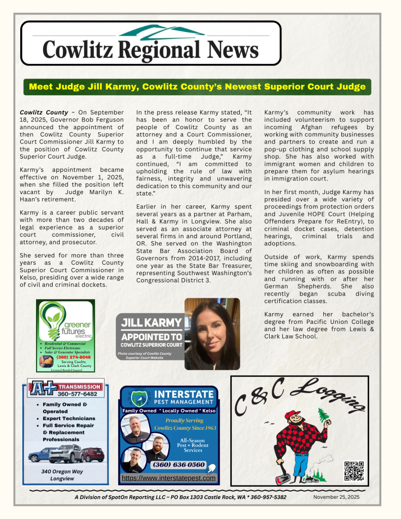 Cowlitz County ~ On September 18, 2025, Governor Bob Ferguson announced the appointment of then Cowlitz County Superior Court Commissioner Jill Karmy to the position of Cowlitz County Superior Court Judge.