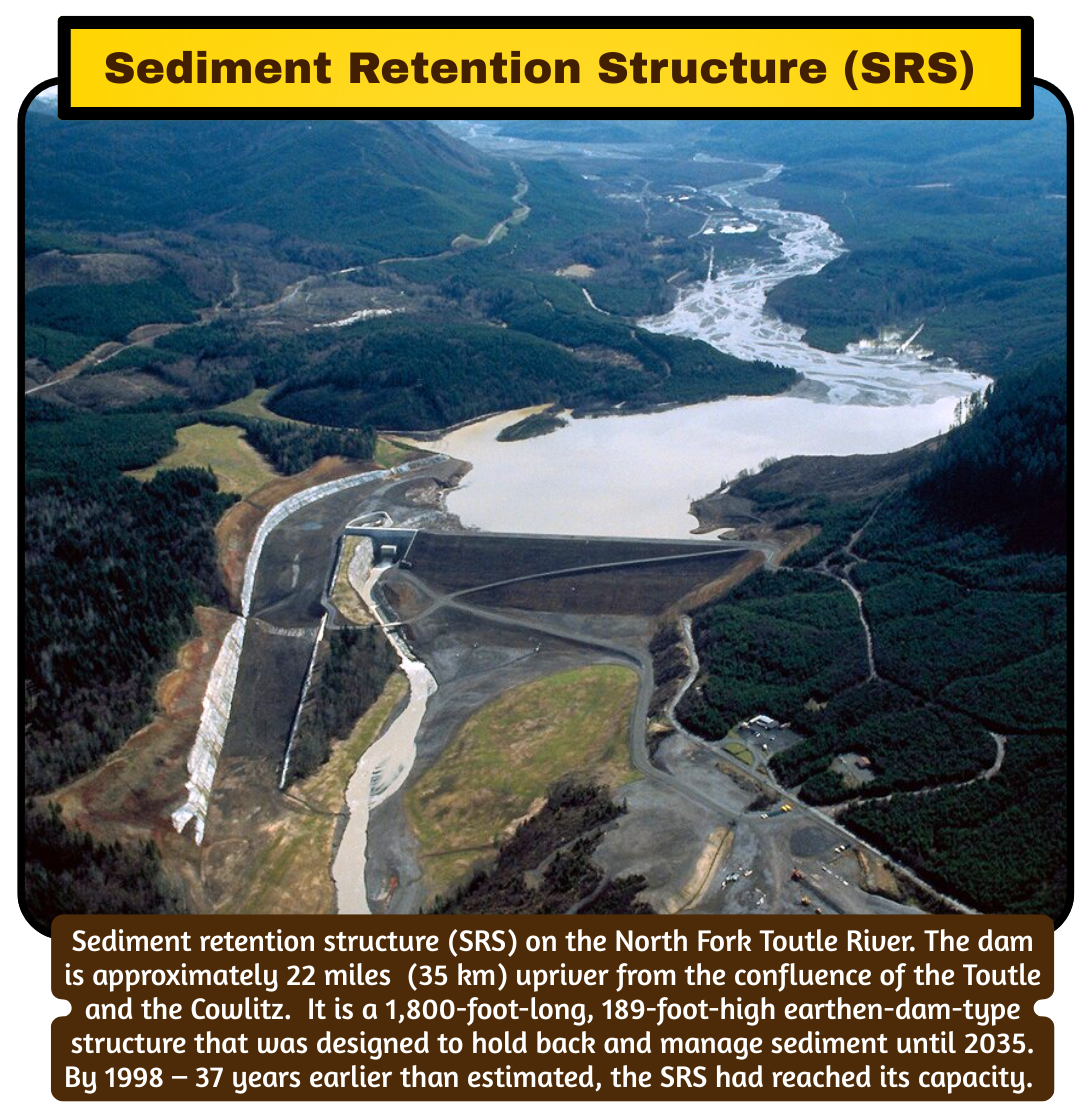 Due to negative views of dredging at the time of the eruption, the Army Corps of Engineers developed a plan to store sediment higher up in the North Fork Toutle River Valley. They completed construction of the Sediment Retention Structure (SRS) in 1989. The SRS is a 1,800-foot-long, 189-foot-high earthen-dam-type structure that was designed to hold back and manage sediment until 2035. By then, they were to develop a long-term solution to manage the flood risk and sediment from Mount Saint Helens. The SRS was originally constructed with a spillway that was fish passable when sediment reached the crest, allowing water to flow around the structure. By 1998 – 37 years earlier than estimated, the SRS had reached its capacity.